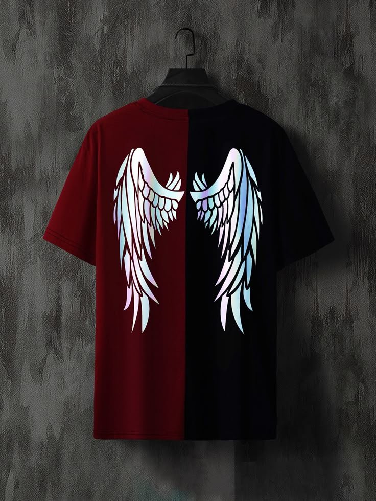 The Dual-Tone Angel Wings Graphic T-Shirt is a striking addition to your streetwear collection. It features a daring half-and-half color split—deep maroon on one side and black on the other. This bold design creates an edgy and eye-catching contrast, perfect for making a statement wherever you go.