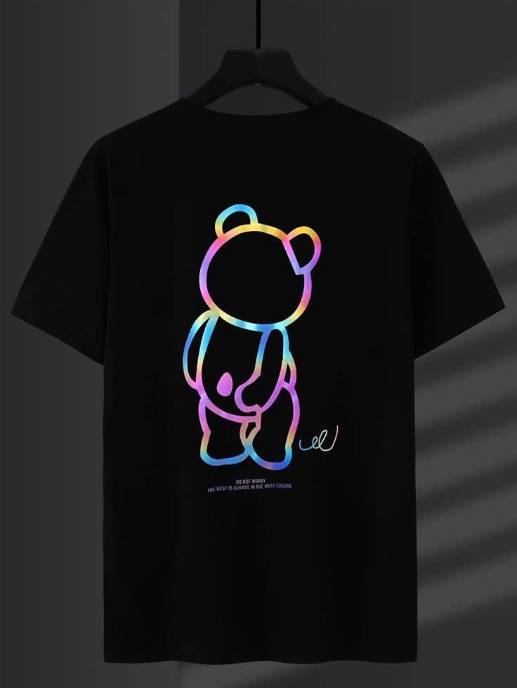 Add a playful yet modern edge to your wardrobe with the Reflective Neon Bear Graphic T-Shirt. Its glowing, multicolor bear graphic set against a classic black base creates the perfect blend of subtlety and boldness for every occasion.